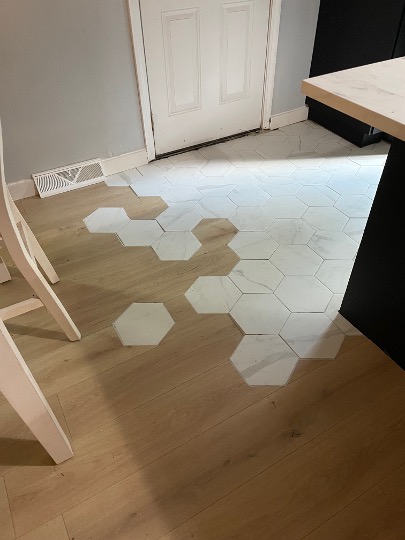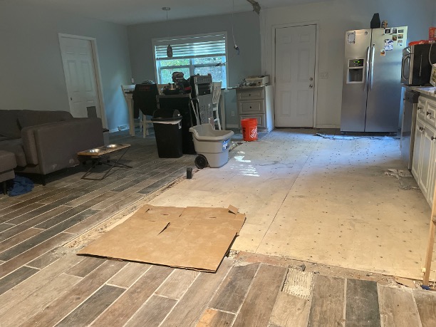 I was committed to doing the work myself, not only to keep costs down but to make the space feel truly personal. I demoed the original wall, removed the old tile flooring, and installed a mix of new tile and laminate flooring throughout the kitchen and living area.