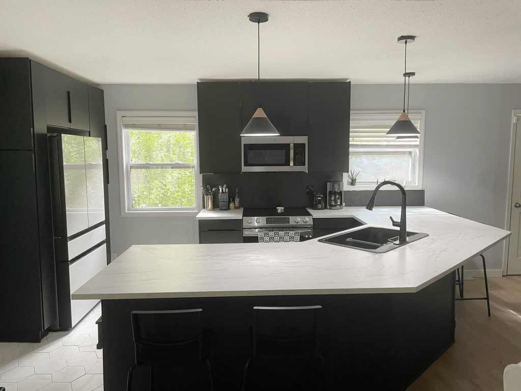 Major structural updates included re-routing plumbing beneath the house to relocate the sink and re-wiring electrical in the attic to reposition the stove and add new pendant lighting. I selected high-quality laminate countertops for a durable, cost-effective finish, and cut them to achieve a unique catty-corner layout. A custom island base was built around the cabinetry to give the space a cohesive, built-in appearance.