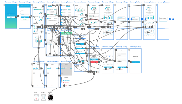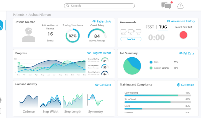I designed the mobile application the patient uses to interact with the IMU data. This included login and setting screens, application tutorials, fall risk score display screens and explanations, historic data and trends, and progress tracking. The user flow is aesthetically pleasing and easy to use, with older populations being considered at the forefront as the intended user audience. I also led the design of the clinician web application that the physical therapist will use when interfacing with the patient to conduct various tests. I used Adobe XD and Illustrator for this effort.